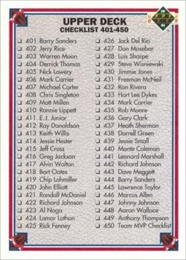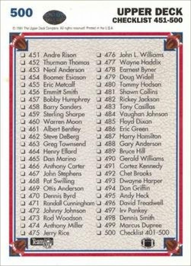 NFL Football 1991 - Cards - Upper Deck - 1991- Partie 2/2700 cartes de base (numérotées) + 9 Game Breaker Holograms (GB1 à GB9) + 20 Football heroes (dont 2 non numérotées) + 2 Super Player (SP1 et SP2) + 2 cartes promos