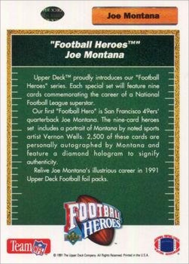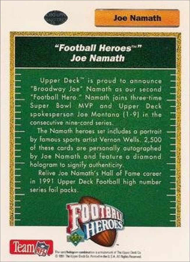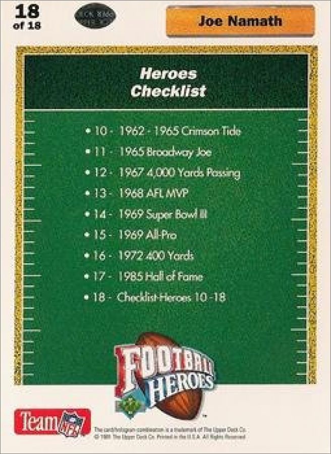Les cartes Heroes (référencées H1 à H18) numérotées de 1 à 9 concerne Joe MONTANA et celles de 10 à 18 Joe NAMATH + 1 carte non numérotée