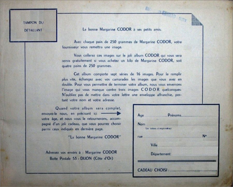 Une image à coller dans l'album était remise pour chaque achat d'un paquet de 250 grammes de margarine Codor de Dijon.