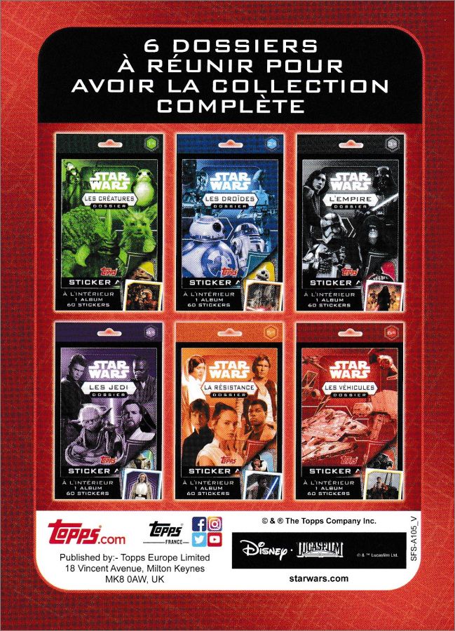 Collection complète de 6 boîtes (1 boîte = 1 dossier) contenant chacune 1 mini-album de 32 pages (taille environ 10 x 15 cm), 60 stickers et 1 "décodeur de secrets" (une carte lenticulaire rouge qui permet de visualiser des informations "cachées").