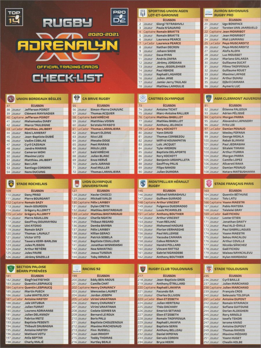 Cartes Capitaine "Top 14" (1 sur 5) *cap1 : 4, 22, 40, 58, 76, 94, 112, 130, 148, 166, 184, 202, 220, 238