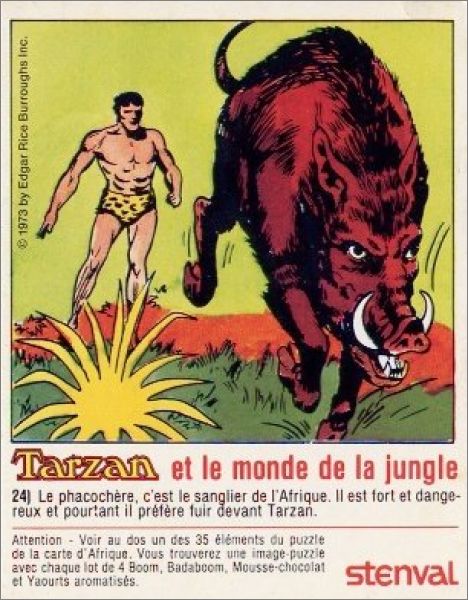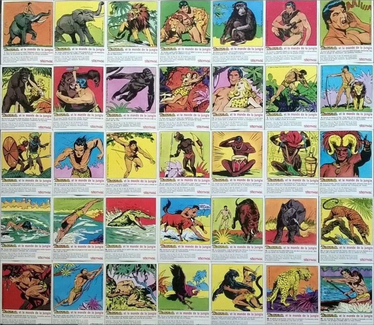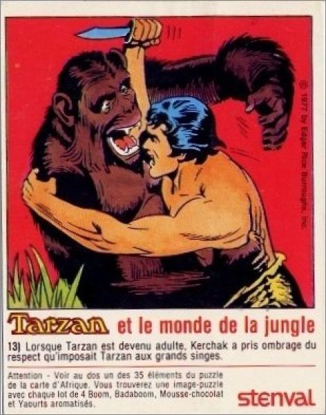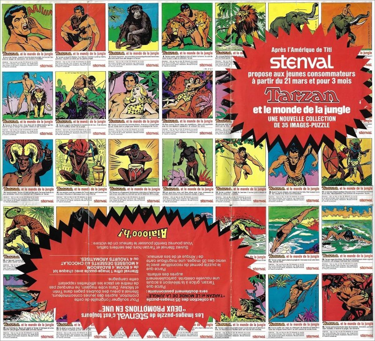 Collection de 35 images-puzzle (numérotées) de Tarzan et le monde de la jungle offertes par la marque Stenval avec les desserts Boom, Badaboom, Mousses au chocolat et yaourts aromatisés.