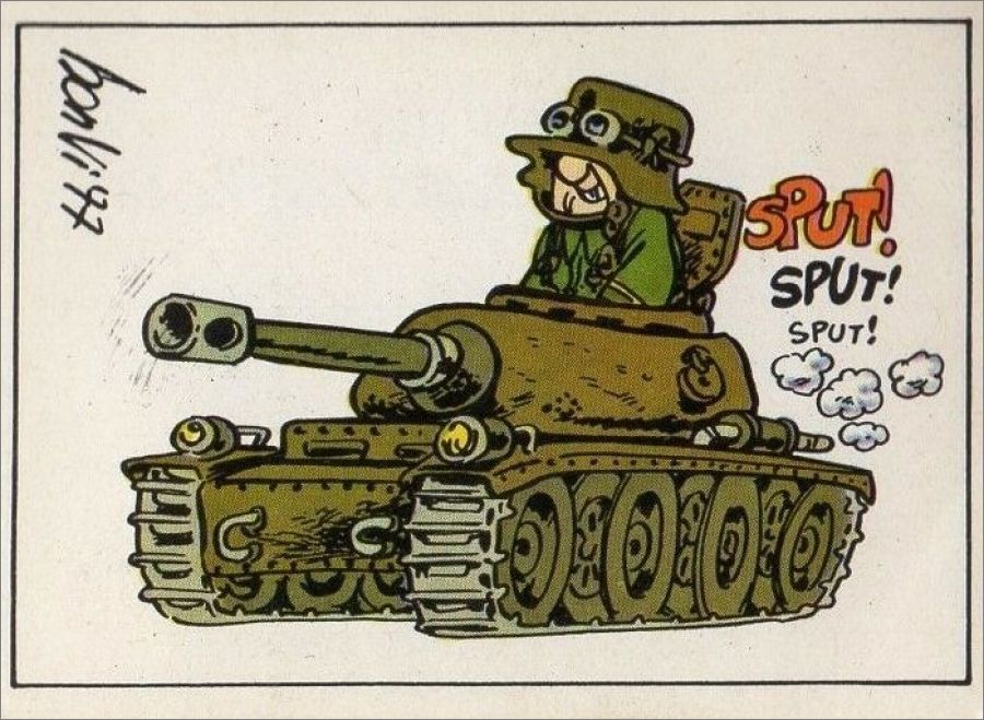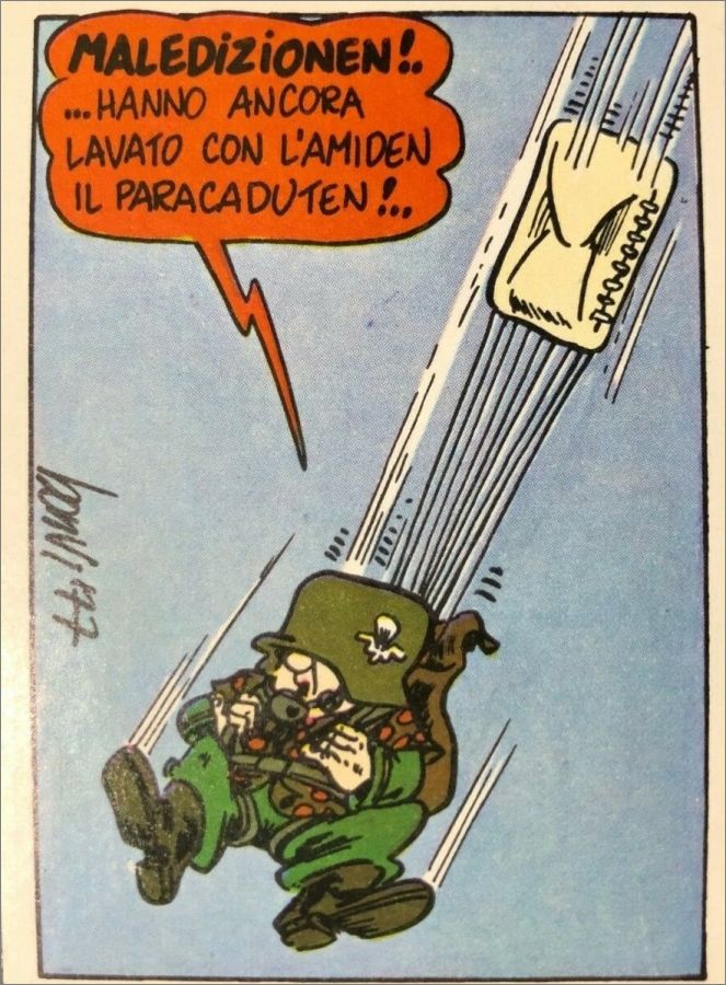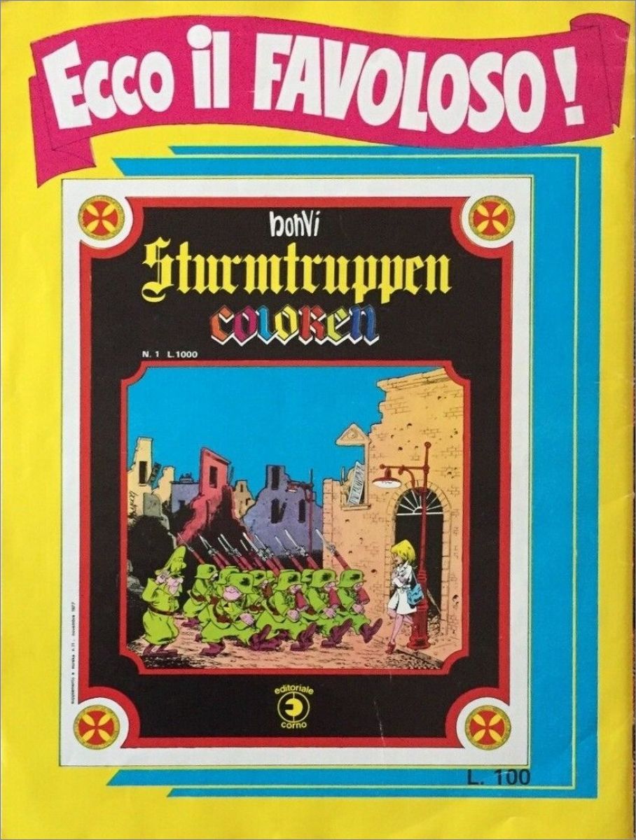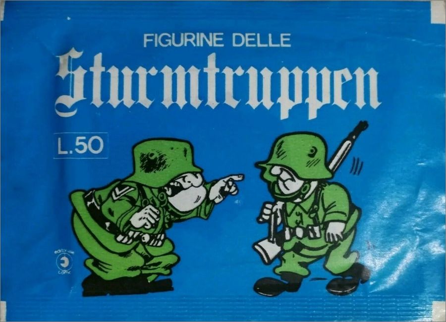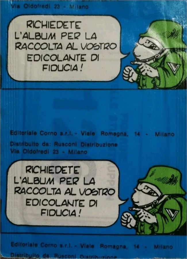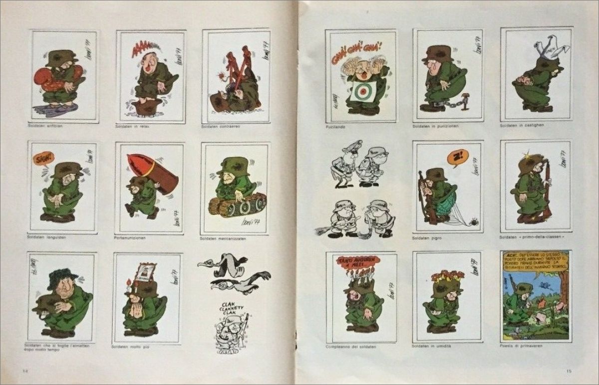 Collection sortie en 1977 en Italie par Editoriale Corno comprenant 240 stickers issue de la série de bandes dessinées antimilitariste et satirique de l'Italien Bonvi