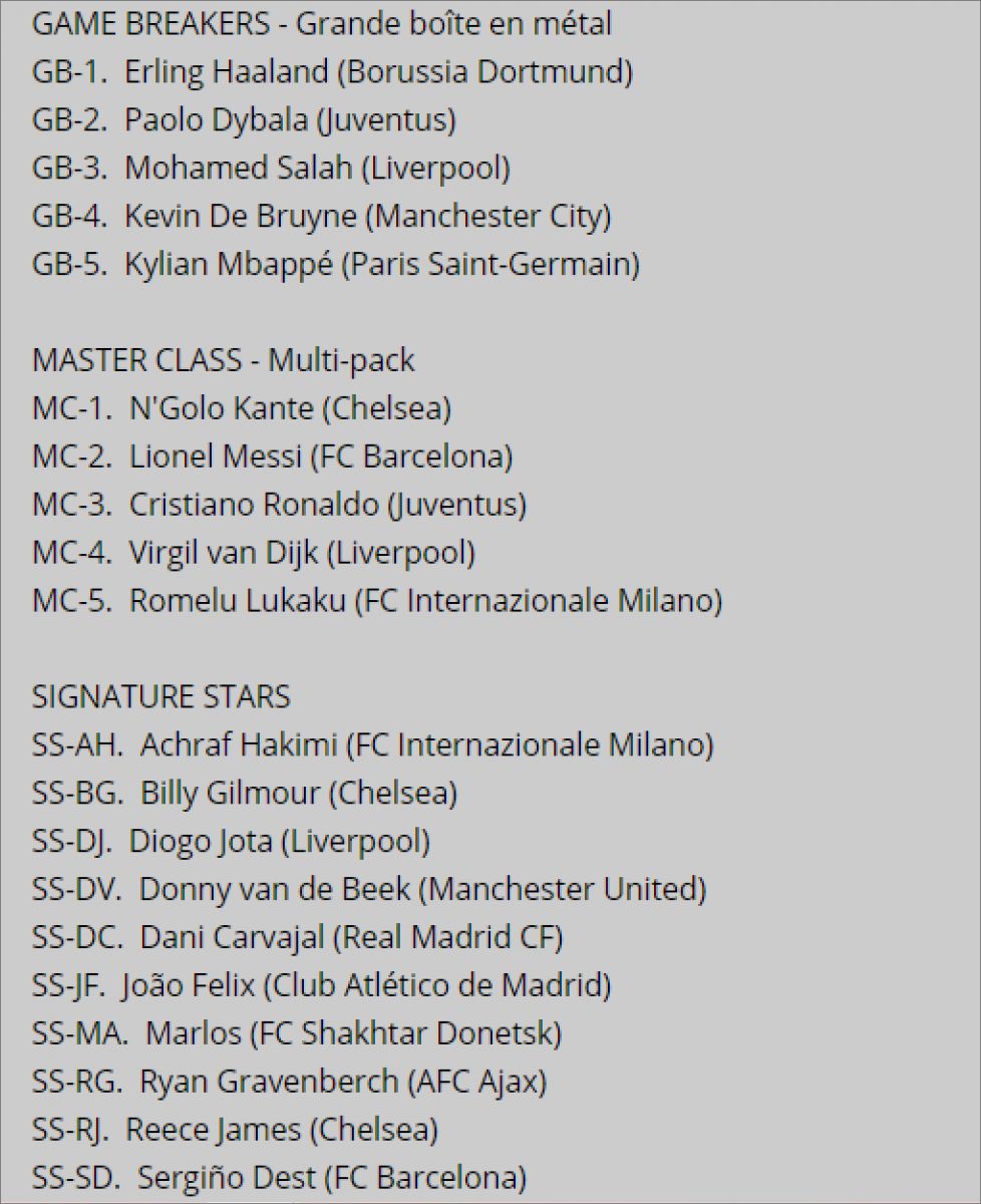 Cartes exclusives *exclu : GB1, GB2, GB3, GB4, GB5, MC1, MC2, MC3, MC4, MC5