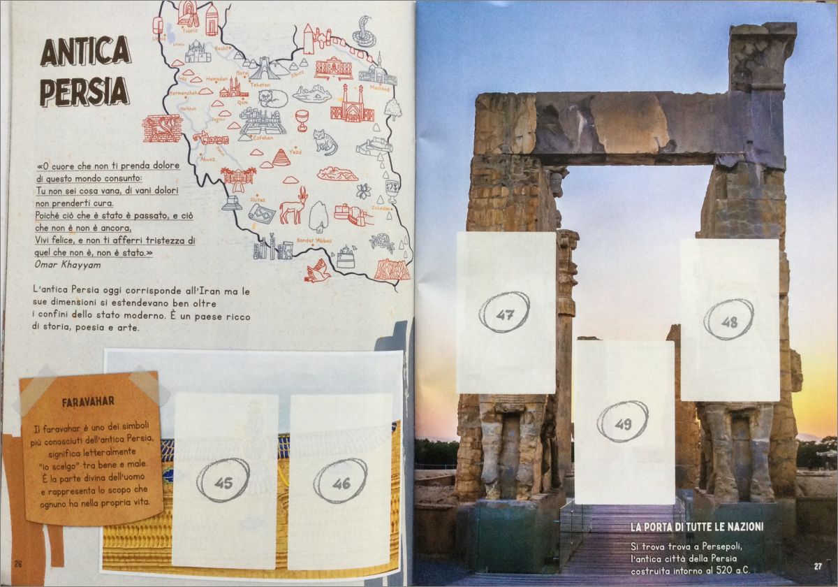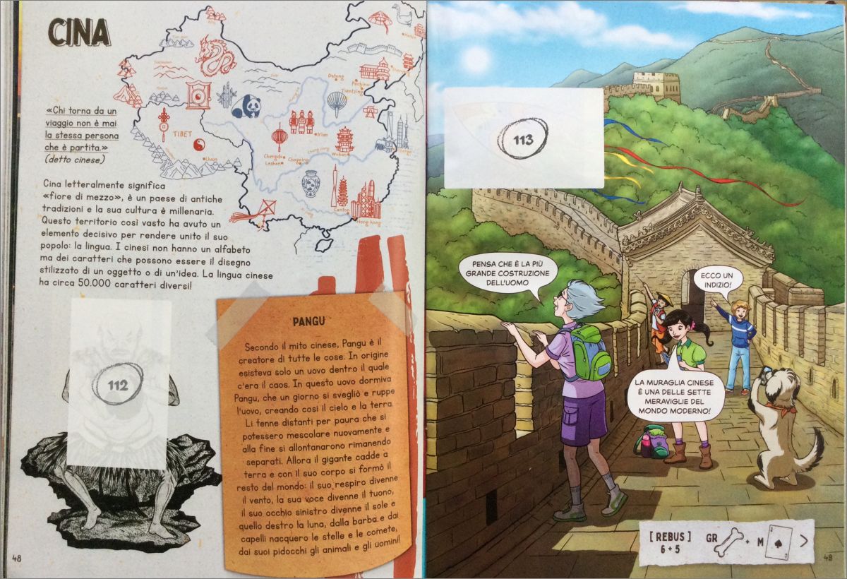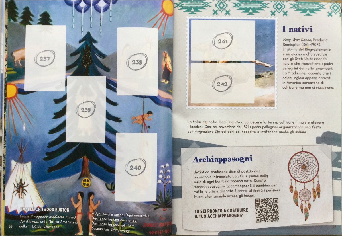 Cet album est conçu pour les enfants de 7 à 14 ans et se compose de 116 pages, 15 planches d'illustration, pas moins de 99 œuvres d'art et monuments à reconstruire grâce aux 288 figurines. Il y a 23 énigmes et beaucoup d'approfondissements sur les cultures du monde : de la légende du mont Fuji au mythe de Bacchus et d'Ariane en passant par les histoires des chevaliers médiévaux. Même dans cette édition, il y a le jeu dans le jeu : les paires de Twin Cards à collectionner pour permettre aux enfants de former la mémoire, en reconnaissant les œuvres à partir de détails. Non seulement cela, beaucoup de contenu supplémentaire à laquelle vous accédez via Qr code, y compris des tutoriels pour les activités à faire à la maison comme il crée votre mandala, votre attrape-rêves, votre matriochka, le dé Aruma ou la lanterne chinoise.