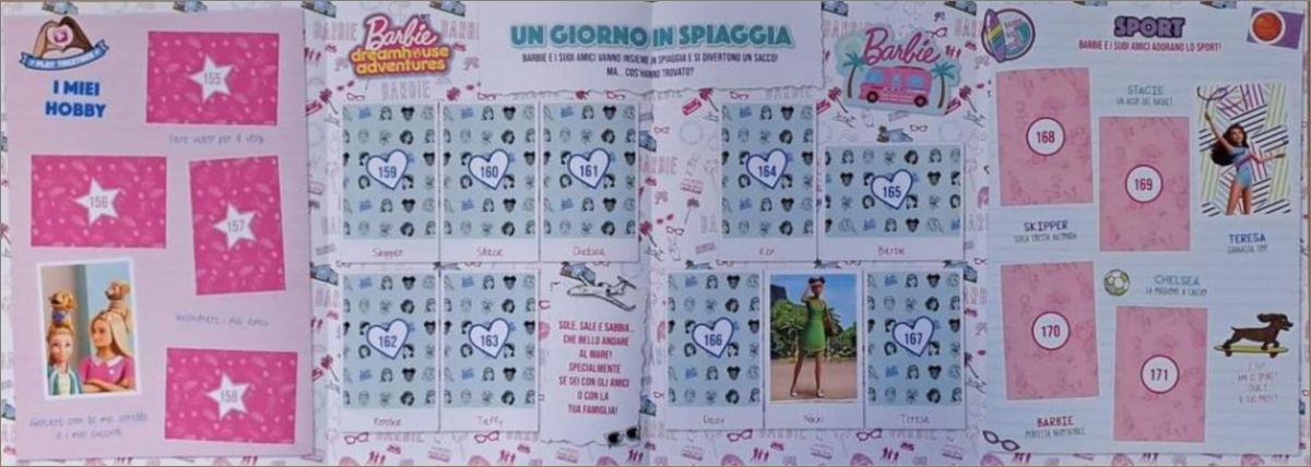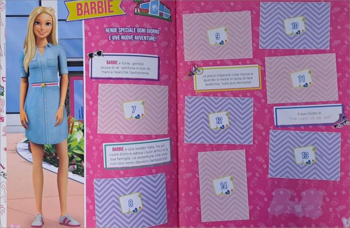 Poster central spectaculaire dédié au monde de Barbie, aux maisons, au sport, à l'université et à tous les camarades de classe. Les Stickers sont à coller des deux côtés, d'une manière ou d'une autre, pour obtenir un mini-album que vous pourrez ouvrir complètement. Ainsi, inutile de le détacher de l'album pour l'admirer.