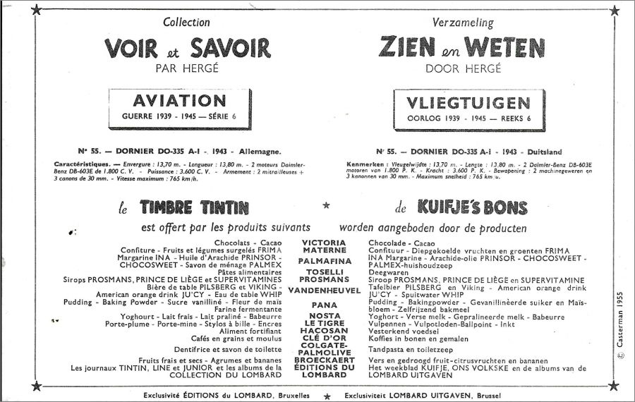 Comporte 60 planches avec les vignettes illustrées par Hergé. (format 128x195 mm) numérotés de 1 à 60 et répartis en 10 fardes de 6 chromos qui s'obtenaient en échange de points Tintin