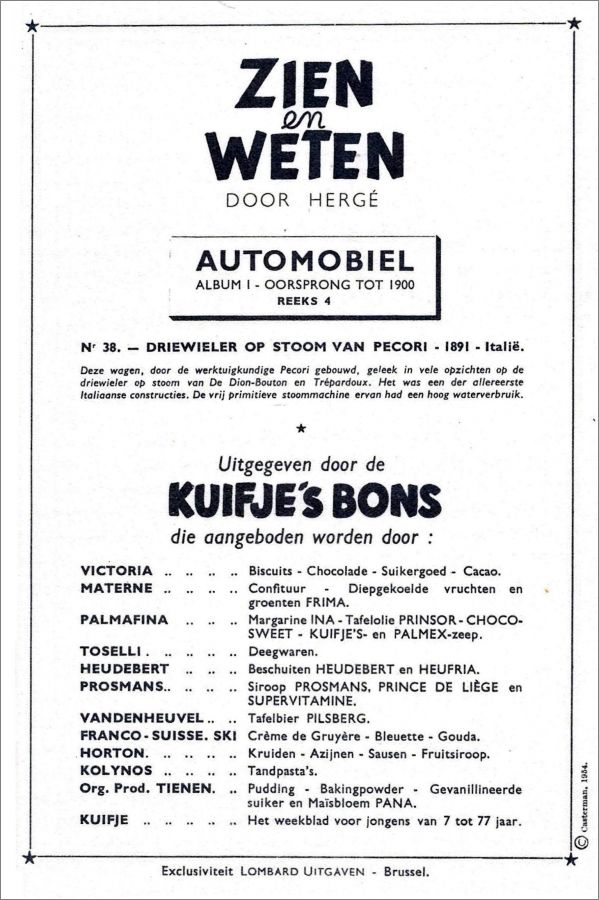 Comporte 60 planches avec les vignettes illustrées par Hergé. (format 128x195 mm) numérotés de 1 à 60 et répartis en 10 fardes de 6 chromos qui s'obtenaient en échange de points Tintin