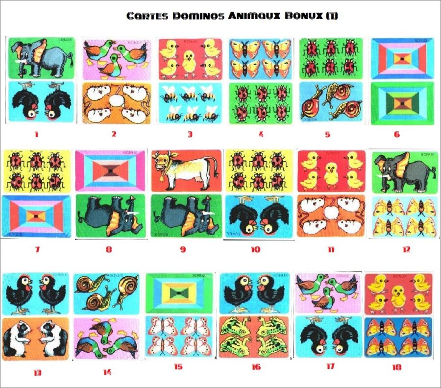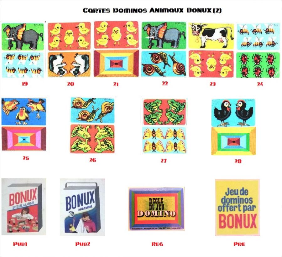 Collection de 28 cartes dominos offertes dans la lessive Bonux en 1978.