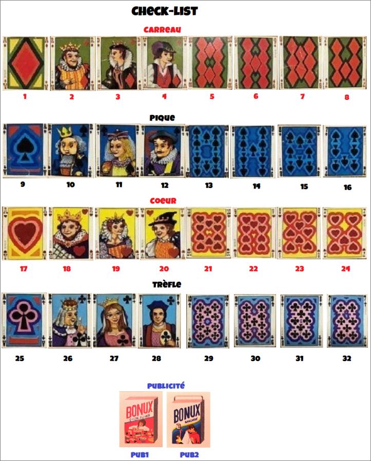 En plus des 32 cartes habituelles (carré, cœur, pique, trèfle du 7 à l'as), la collection comprend également 2 cartes publicitaires (*Pub1 et *Pub2).
