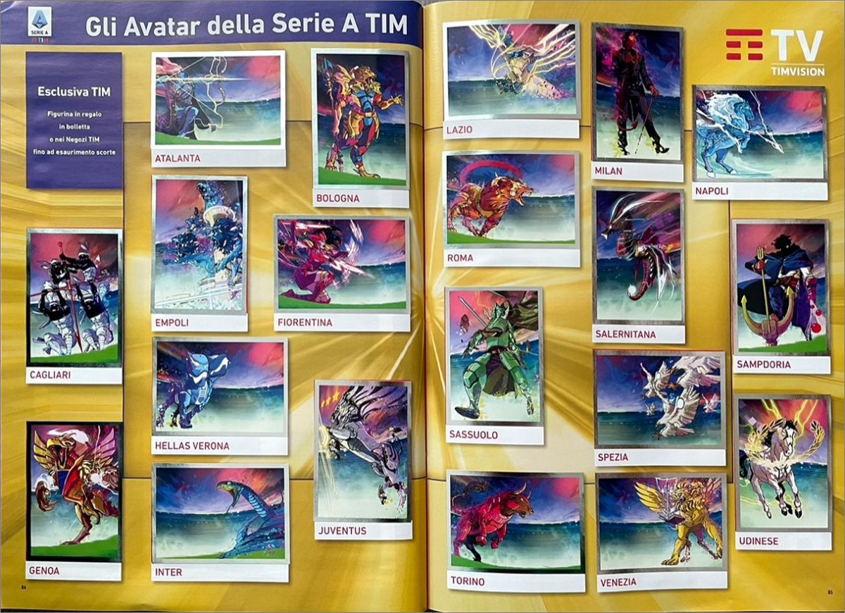 A1 à A20 = Écussons des clubs de style manga obtenu avec des factures de téléphone TIM ou en boutique.