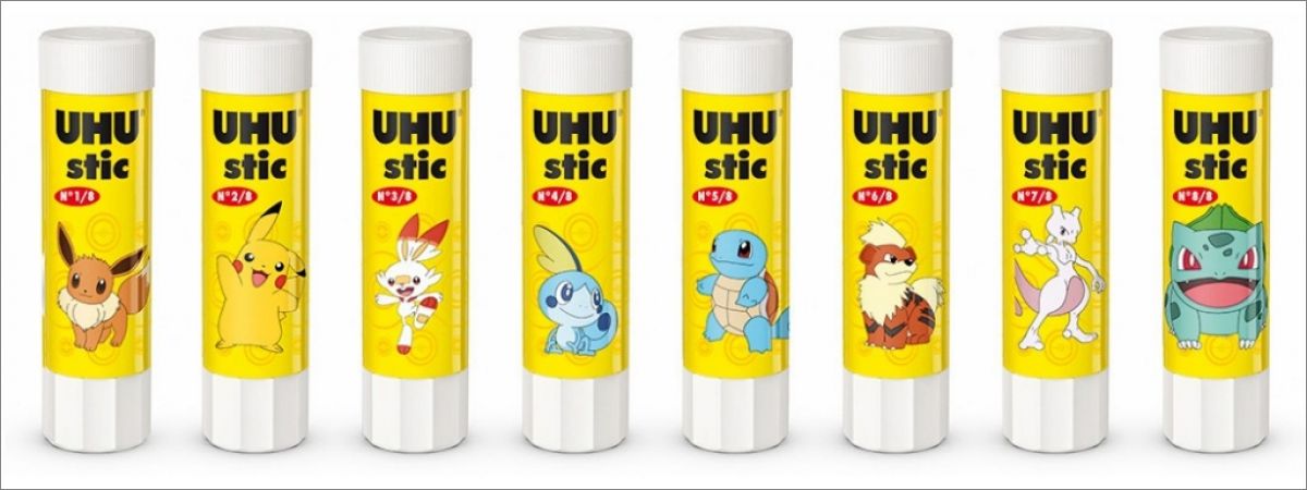 Collection de 8 étiquettes qui entourent les stic de colle UHU de 8g.