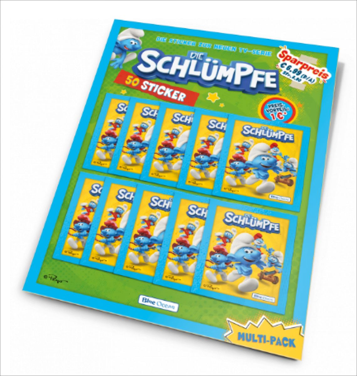 Il existe un blister et un multipack avec 10 pochettes à un prix spécial schtroumpf.