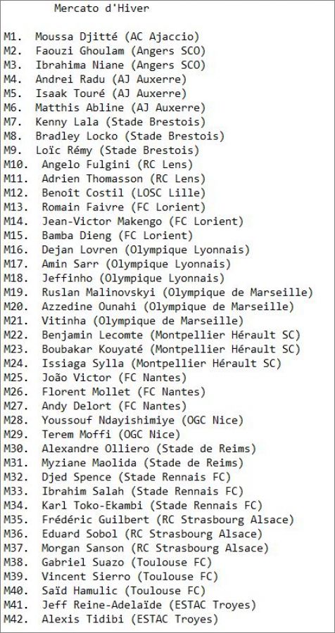 Images du set de MAJ "mercato" *mer : F1, F2, F3, F4, F5, F6, F7, F8, F9, F10, F11, F12, M1, M2, M3, M4, M5, M6, M7, M8, M9, M10, M11, M12, M13, M14, M15, M16, M17, M18, M19, M20, M21, M22, M23, M24, M25, M26, M27, M28, M29, M30, M31, M32, M33, M34, M35, M36, M37, M38, M39, M40, M41, M42