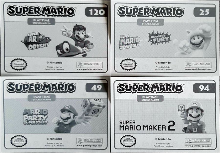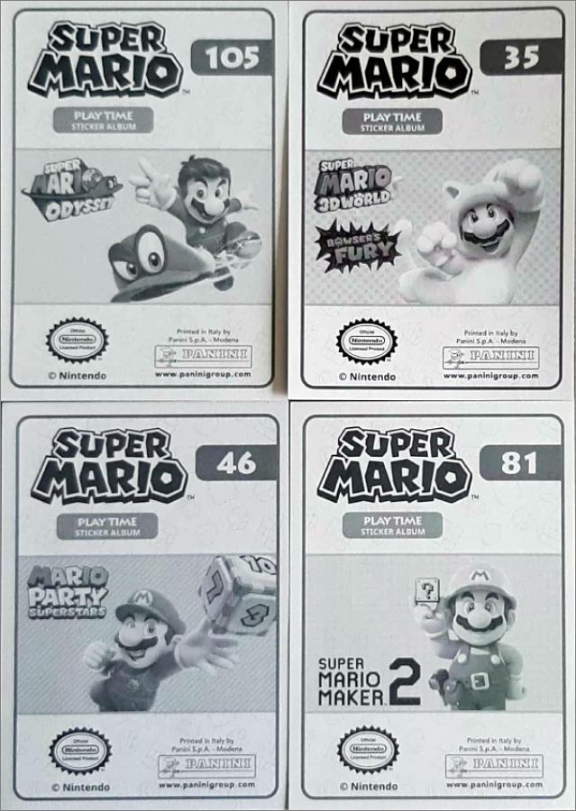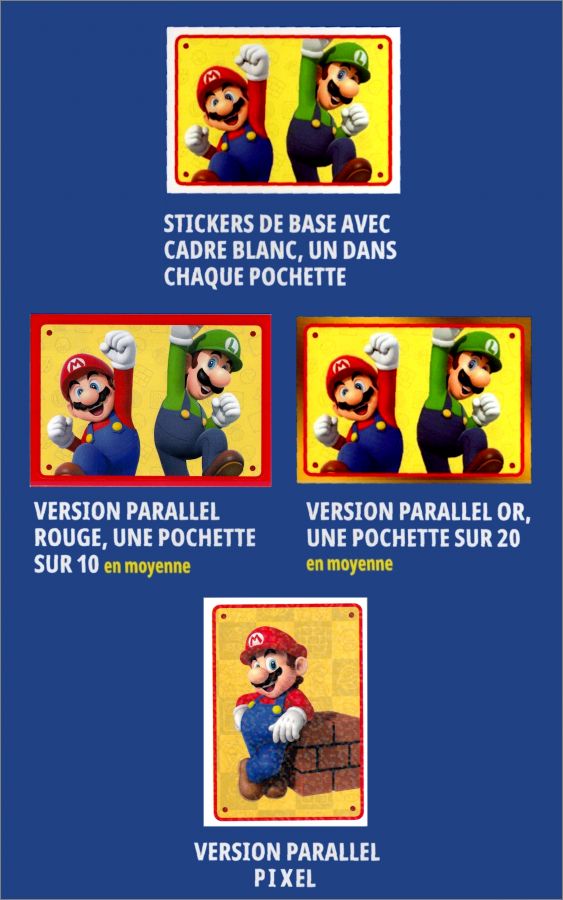 Panini /Nintendo : 1 à 144, M1 à M32, 64 Parallèles Rouge, 64 Parallèles Gold, 64 Parallèles Pixel, 5 stickers en édition spéciale, 6 Cartes édition Limitée dont 5 également en version Gold et une en XXL
