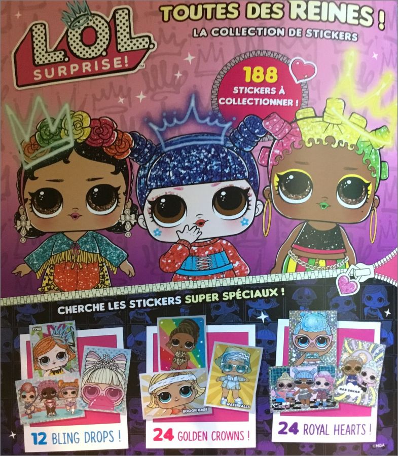 LOL Surprise Toutes des Reines est une collection de 188 stickers dont 60 spéciaux (12 Blind Drops, 24 Golden Crowns et 24 Royal Hearts).