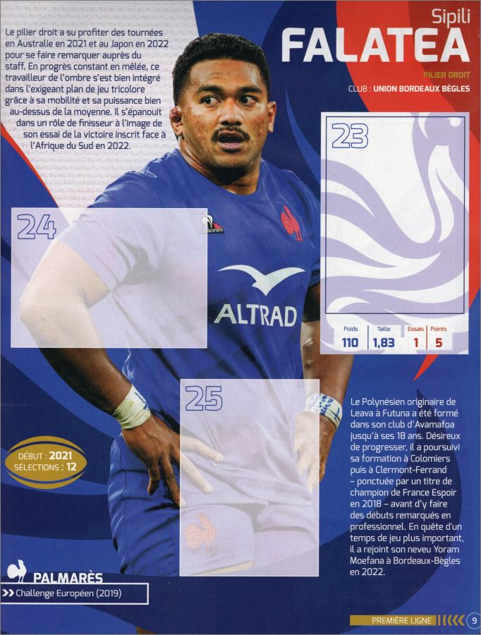 Notre album de 40 pages regorge de records, d'anecdotes et présente 27 joueurs du XV de France ! Tu trouveras également des pages dédiées au XV de France féminine et aux Équipes de France à sept ! Les plus grandes stars sont de la partie : Antoine Dupont, Paul Willemse, Grégory Alldritt, Romain Ntamack ou encore Gael Fickou !