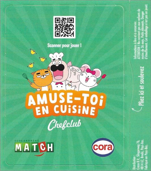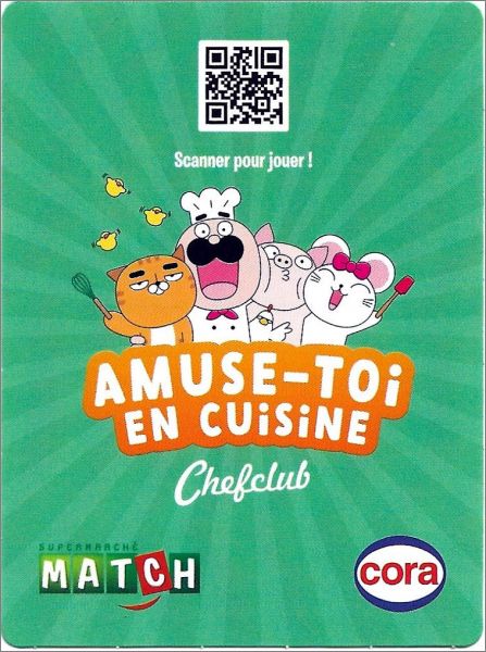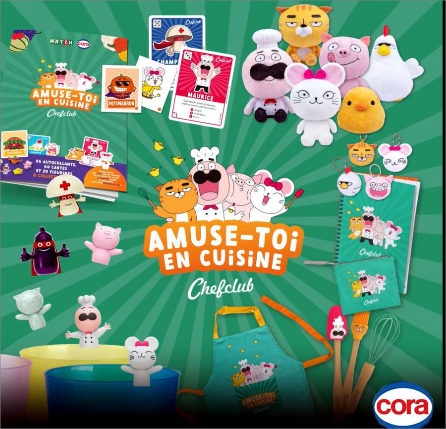 Chefclub x Cora et Supermarché Match réalisent une opération inédite et te donnent l'opportunité de constituer une collection unique Chefclub. Au menu, un album collector avec des jeux et des recettes, des cartes de jeu, des autocollants, des figurines, des peluches et plein d'autres produits que tu vas adorer ! Et cerise sur le gâteau, tu peux même tenter de remporter un atelier cuisine dans les studios Chefclub à Paris. Alors enfile ton tablier et prépare-toi à vivre jusqu'à 9 semaines complètement toquées !