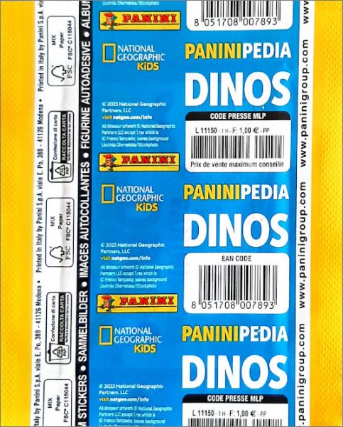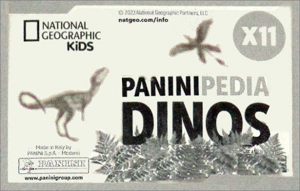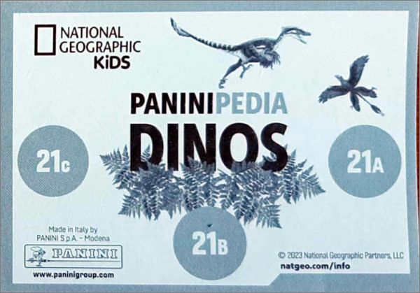 Dinos - National Géographic Kids - Paninipedia - Panini 2023Il existe des images avec des lettres AB et ABC, merci de nous les signaler aussi pour qu'on modifie les références en conséquence.