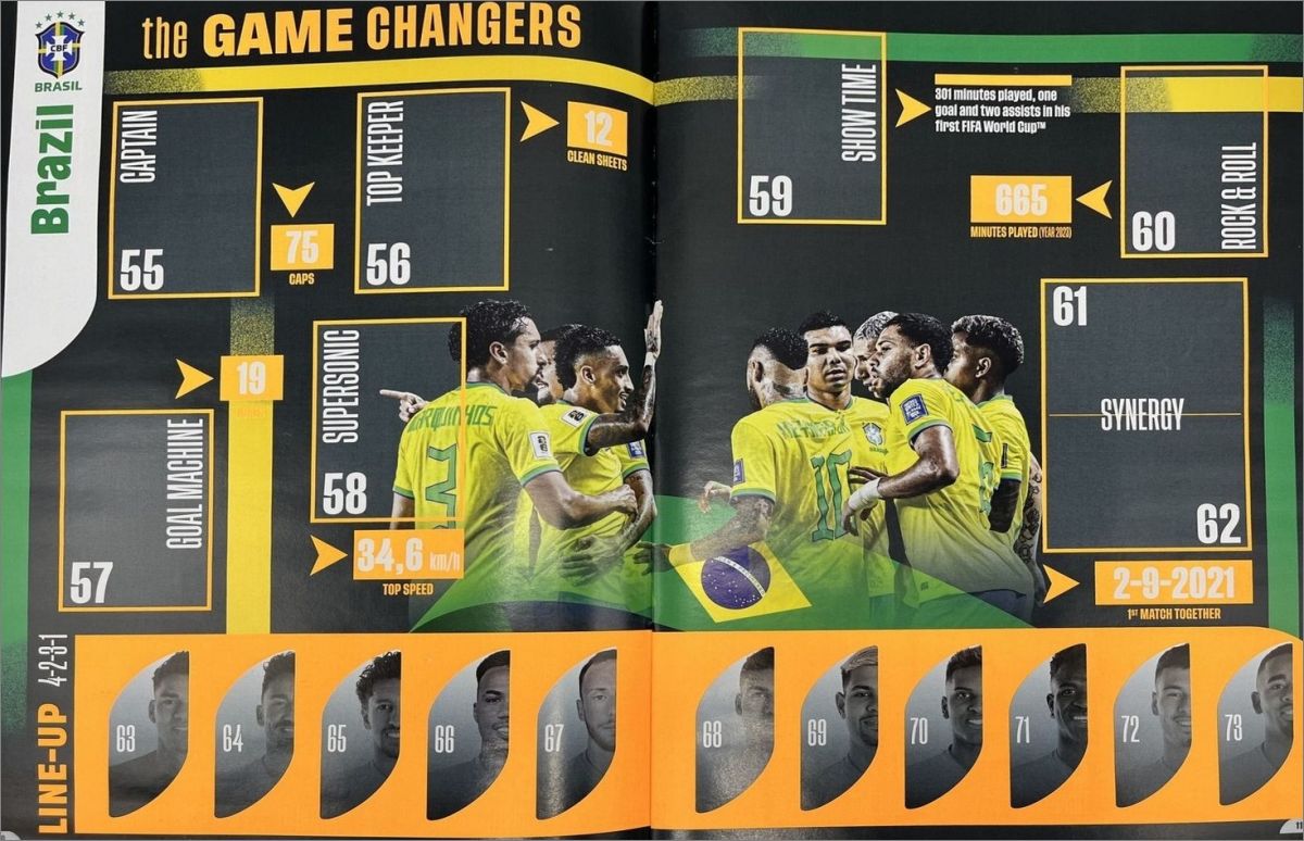 La collection contient plus de 300 stickers, représentant les 8 nations qui remporté la FIFA World Cup™: Brésil, Allemagne, Italie, Argentine, France, Uruguay, Angleterre et Espagne ! Chaque équipe est représentée sur 4 pages, avec des demi-stickers et des images d'action des joueurs actuels. De plus, la collection regorge de faits historiques de la FIFA World Cup™ et d'anecdotes sur la FIFA, qui fêtera son 120e anniversaire en 2024.