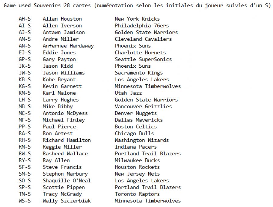 Cartes Game used Souvenirs *GuS : AH-S, AI-S, AJ-S, AM-S, AN-S, EJ-S, GP-S, JK-S, JW-S, KB-S, KG-S, KM-S, LH-S, MB-S, MC-S, MF-S, PP-S, RA-S, RH-S, RM-S, RW-S, RY-S, SF-S, SM-S, SO-S, SP-S, TM-S, WS-S