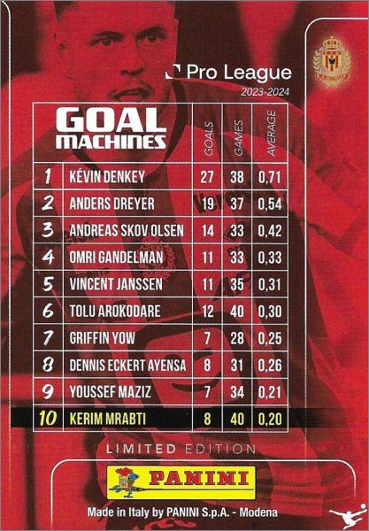 Football Pro League 2025 - Sticker (part 1) Panini BelgiqueCette année,10 cartes Goal machines en édition limitée reprenant les meilleurs buteurs du championnat 2023/2024 ont été éditées et, disponibles uniquement en ligne (ces cartes seront référencées GM+n° selon détail suivant) :