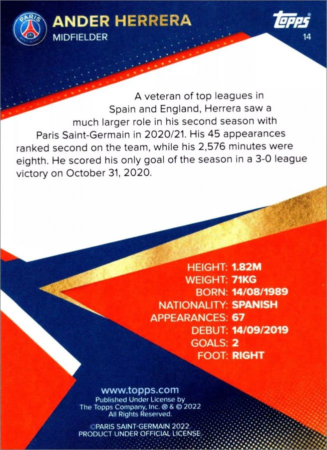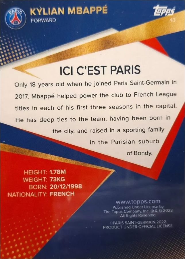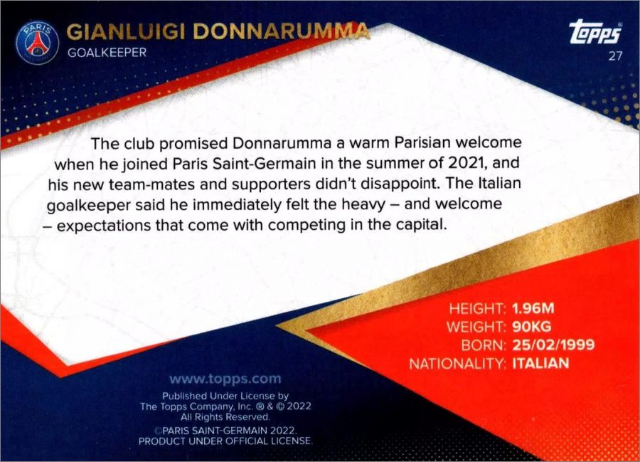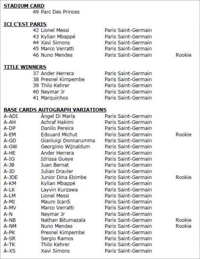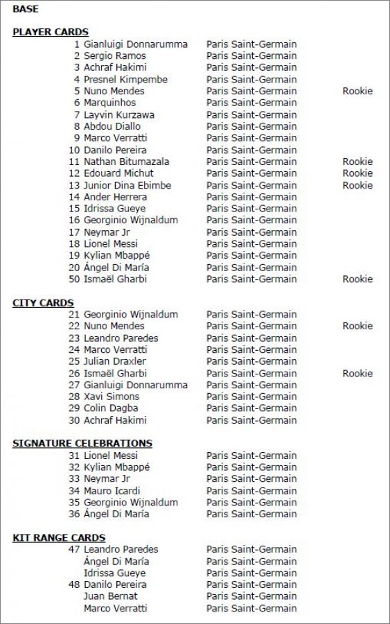 Pour les cartes en versions parallèles voir les fiches suivantes :Paris Saint-Germain season 2021-22 Parallel 1/2 Card Topps Paris Saint-Germain season 2021-22 Parallel 2/2 Card Topps