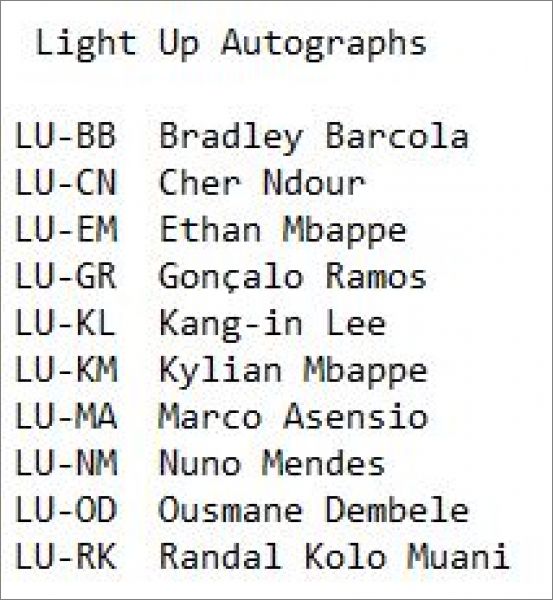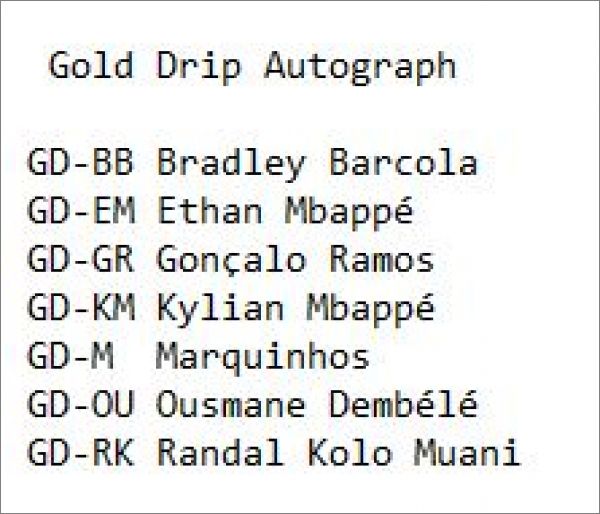 Cartes Gold Drip et Light Up autographes *GLaut : GD-BB, GD-EM, GD-GR, GD-KM, GD-M, GD-OU, GD-RK, LU-BB, LU-CN, LU-EM, LU-GR, LU-KL, LU-KM, LU-MA, LU-NM, LU-OD, LU-RK