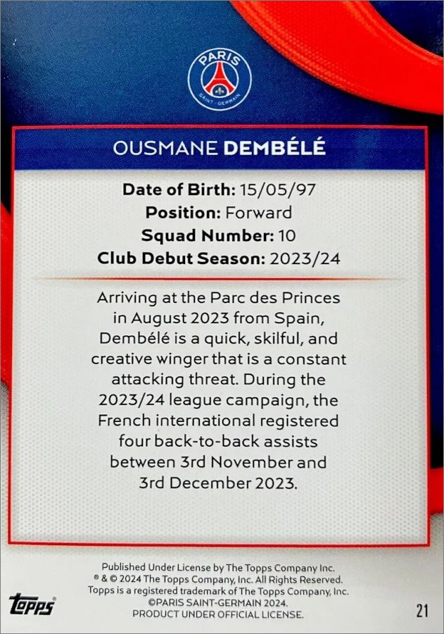 Après avoir remporté un nouveau titre de champion, Topps est fier de présenter la série Topps Paris Saint-Germain 2023/24!