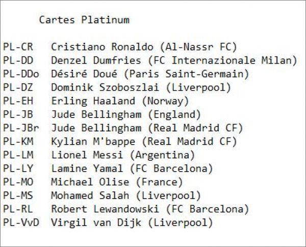 Cartes Platinum et Rising Star *pla : PL-CR, PL-DD, PL-DDo, PL-DZ, PL-EH, PL-JB, PL-JBr, PL-KM, PL-LM, PL-LY, PL-MO, PL-MS, PL-RL, PL-VvD, RS1, RS2, RS3, RS4, RS5, RS6