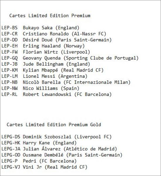 Cartes Limited Edition *lim : ELE-CP, KO-HK, LE-150, LE-350, LE-AB, LE-AEK, LE-AGC, LE-AGaa, LE-AGab, LE-AGr, LE-AH, LE-AI, LE-AK, LE-ALa, LE-ALu, LE-AM, LE-AN, LE-APe, LE-APl, LE-ARa, LE-ARi, LE-AS, LE-AT, LE-AZ, LE-BB, LE-BD, LE-BM, LE-BS, LE-BT, LE-BV, LE-C, LE-CG, LE-CMa, LE-CMo, LE-CR, LE-DDi, LE-DDo, LE-DDu, LE-DH, LE-DKl, LE-DKu, LE-DL, LE-DO, LE-DR, LE-DSzo, LE-DSzy, LE-DV, LE-EHa, LE-EHu, LE-EL, LE-ET, LE-FD, LE-FI, LE-FK, LE-FM, LE-FO, LE-FPe, LE-FPi, LE-FV, LE-FW, LE-GI, LE-GKa, LE-GKo, LE-GKy, LE-GMa, LE-GMi, LE-GQ, LE-GS, LE-GT, LE-GV, LE-HC, LE-HE, LE-HL, LE-HMa, LE-HMo, LE-IC, LE-IJ, LE-IP, LE-IS, LE-JA, LE-JB, LE-JBE, LE-JBu, LE-JF, LE-JHam, LE-JHat, LE-JL, LE-JN, LE-JP, LE-JSc, LE-JSu, LE-JTa, LE-JTu, LE-JV, LE-JY, LE-KD, LE-KK, LE-KM, LE-KTa, LE-KTs, LE-KTz, LE-KZ, LE-LE, LE-LKa, LE-LKu, LE-LL, LE-LMa, LE-LMe, LE-LP, LE-LR, LE-LY, LE-LYS, LE-MBi, LE-MBr, LE-MC, LE-MG, LE-MH, LE-MJ, LE-MK, LE-MM, LE-MOd, LE-MOl, LE-MOz, LE-MR, LE-MSal, LE-MSar, LE-MY, LE-NBa, LE-NBr, LE-NM, LE-NO, LE-NWi, LE-NWo, LE-OD, LE-OP, LE-P, LE-PC, LE-PEH, LE-PM, LE-PR, LE-PS, LE-PZ, LE-RB, LE-RF, LE-RG, LE-RKo, LE-RKr, LE-RLea, LE-RLew, LE-RLj, LE-RPa, LE-RPep, LE-RPer, LE-RY, LE-Ra, LE-Ro, LE-Rod, LE-SB, LE-SG, LE-SHe, LE-SHo, LE-TAA, LE-TC, LE-TK, LE-TN, LE-TP, LE-TS, LE-Ta, LE-Te, LE-Tr, LE-V, LE-VD, LE-VG, LE-VJ, LE-VT, LE-WE, LE-WS, LE-WW, LE-YB