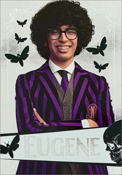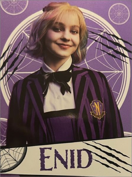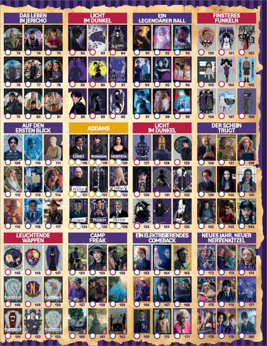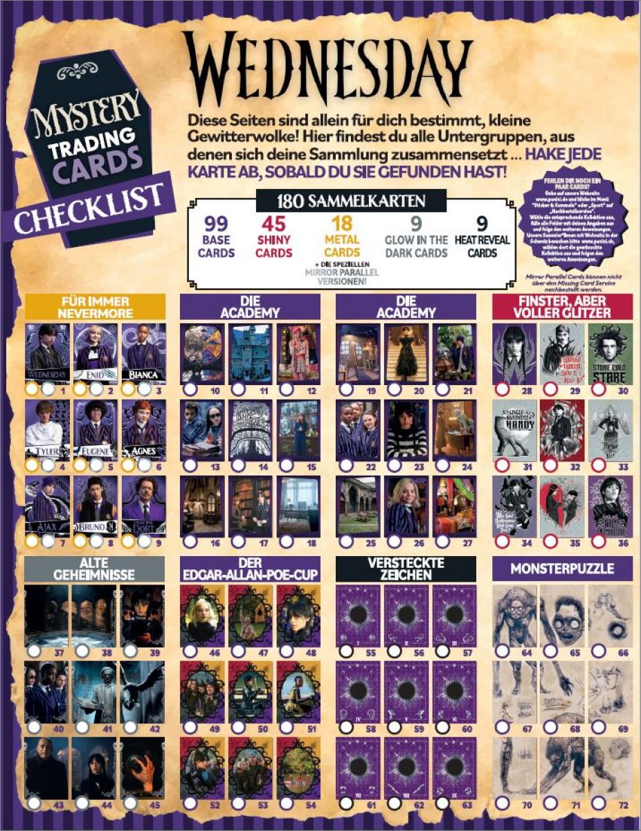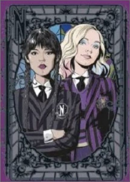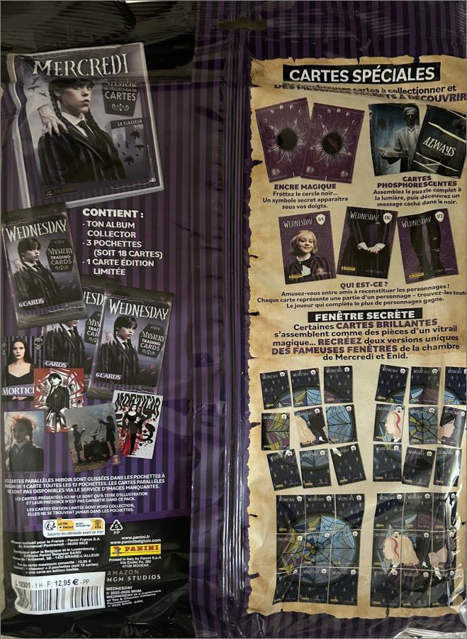 Certaines cartes ont une lettre au dos B, H, K qui permettent de reproduire divers visuels des vitraux de la chambre d'Enid et de MercrediAvec un total de 180 cartes uniques, dont 45 cartes brillantes, 18 cartes métallisées, 9 cartes mystérieuses phosphorescentes qui brillent dans le noir et 9 cartes thermiques qui ne révèlent leurs secrets qu'à la chaleur, vous pouvez découvrir l'univers de Mercredi d'une manière totalement nouvelle.