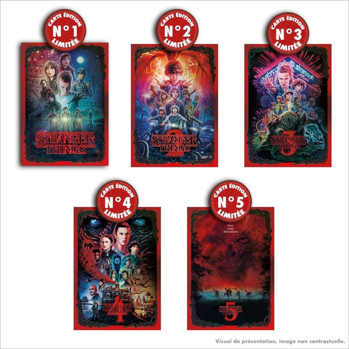 - Les cartes Édition Limitée n° 1, n° 2, n° 3, n° 4 et n° 5 sont réparties en aléatoire dans le blister de 8 pochettes + 1 carte Édition Limitée